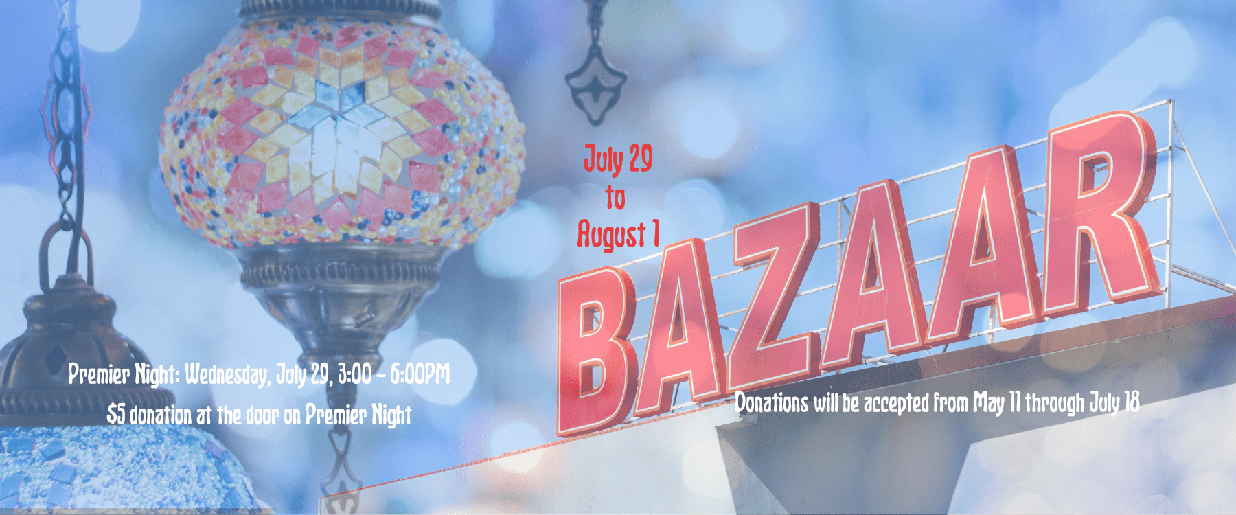 Bazaar Donations will be accepted from May 11 to July 18, Monday through Saturday, from 8:00 to 11:00AM. Closed on Sundays. Our wonderful volunteers will happily review all items upon arrival. Please note that we cannot accept items that are stained, broken, damaged, or not functioning properly. Rugs must be 9′ x 12′ or smaller, as larger ones will not be accepted. Only up-to-date smart TVs will be accepted. Keep an eye out for more details on other restricted items, to be posted soon!
