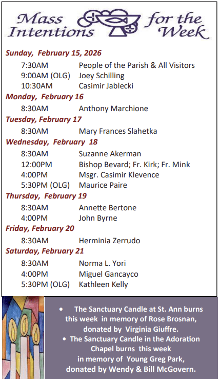 The Flame of Love Rosary devotion is held on Tuesday in St. Ann Church. It begins at 10:15 and lasts approximately 40 minutes. The Flame of Love is a new Church-Approved Devotion; for more information, call Anna at 302-539-5796 or Brenda at 610-742-5944.