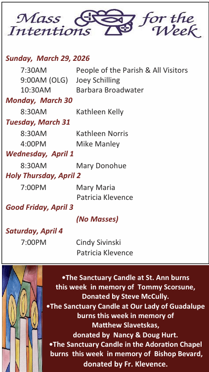 The First Saturday Devotion to the Immaculate Heart of Mary will be held following the 8:30 AM mass in St. Ann Church on the first Saturday of every month.