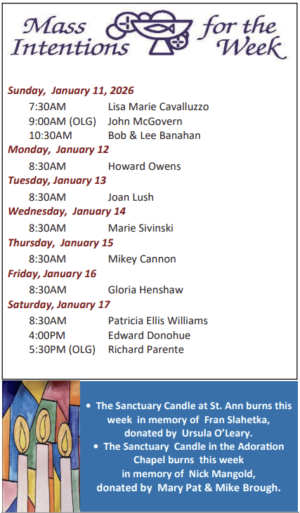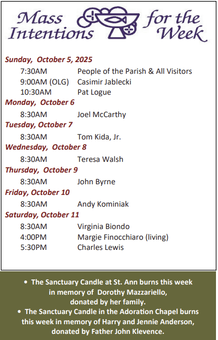 There will be a Pro-Life Public Rosary’ every Monday after 8:30 am Mass, outside the front doors of St. Ann Church.