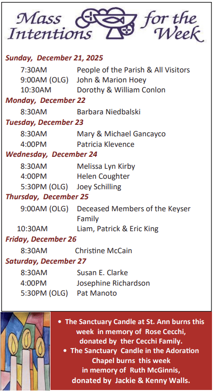 The Flame of Love Rosary devotion is held on Tuesday in St. Ann Church. It begins at 10:15 and lasts approximately 40 minutes. The Flame of Love is a new Church-Approved Devotion; for more information, call Anna at 302-539-5796 or Brenda at 610-742-5944.