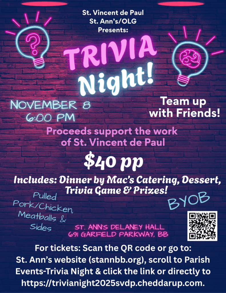 Join us for a wonderful dinner and a fun night of trivia on Saturday, November 8th, 6pm in Delaney Hall. BYOB. Team up with friends! Each member of the top three teams will win a gift card! Proceeds will support the work of St. Vincent de Paul. Tickets are $40pp.